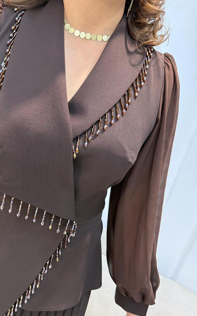 Верх с плиссированной юбкой. Бусы тон в тон, шифоновые рукава. Расход юбки бодрая!