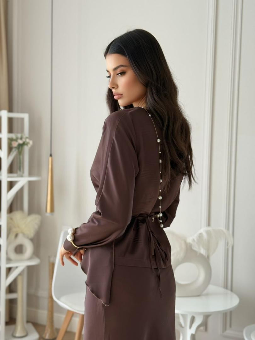 Блуза с длинными рукавами, завязывающейся крест-накрест сзади - акцент на тонкую талию и изящный силуэт.