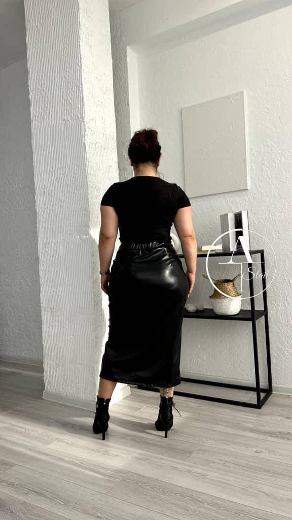 Кожаная чёрная юбка с замками с двойной посадкой на талии и длинной, которая удлиняет образ