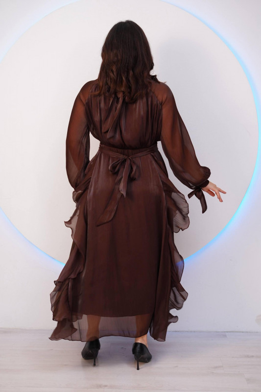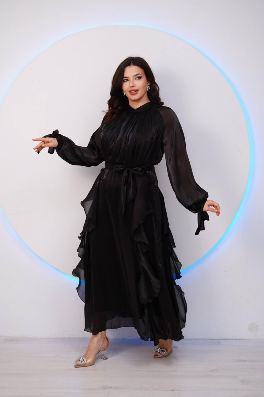Вечернее платье из воздушной органзы — идеальный выбор для особых случаев. Легкая, струящаяся ткань красиво ложится по фигуре, создавая утончённый силуэт. Модель украшена аккуратными воланами и мягкими складками, которые добавляют образу нежности и романтичности.