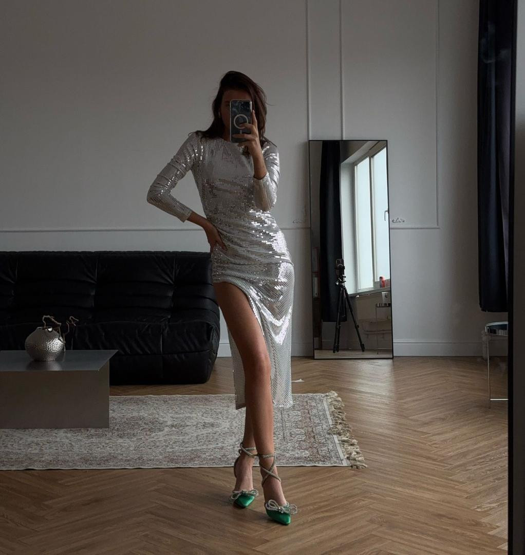 Платье макси, полностью украшенное сверкающими пайетками, идеально для эффектных выходов и ярких событий