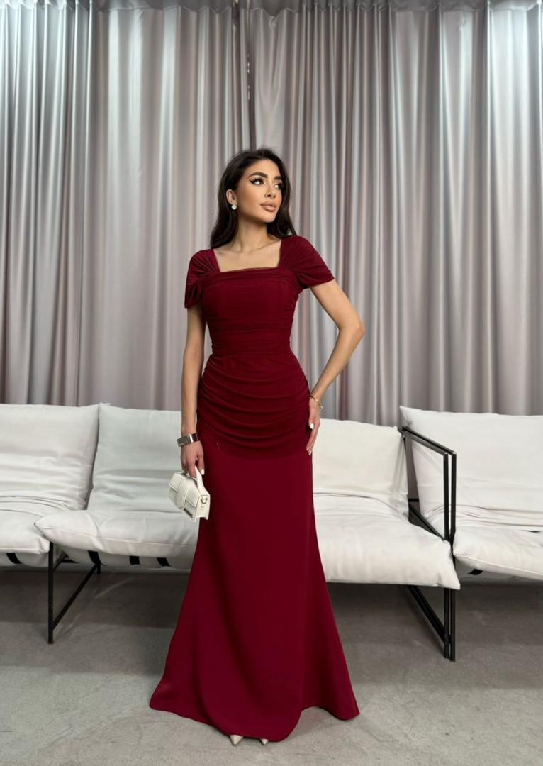 Верх платья оформлен квадратным вырезом и аккуратными короткими рукавчиками, которые подчёркивают линию плеч